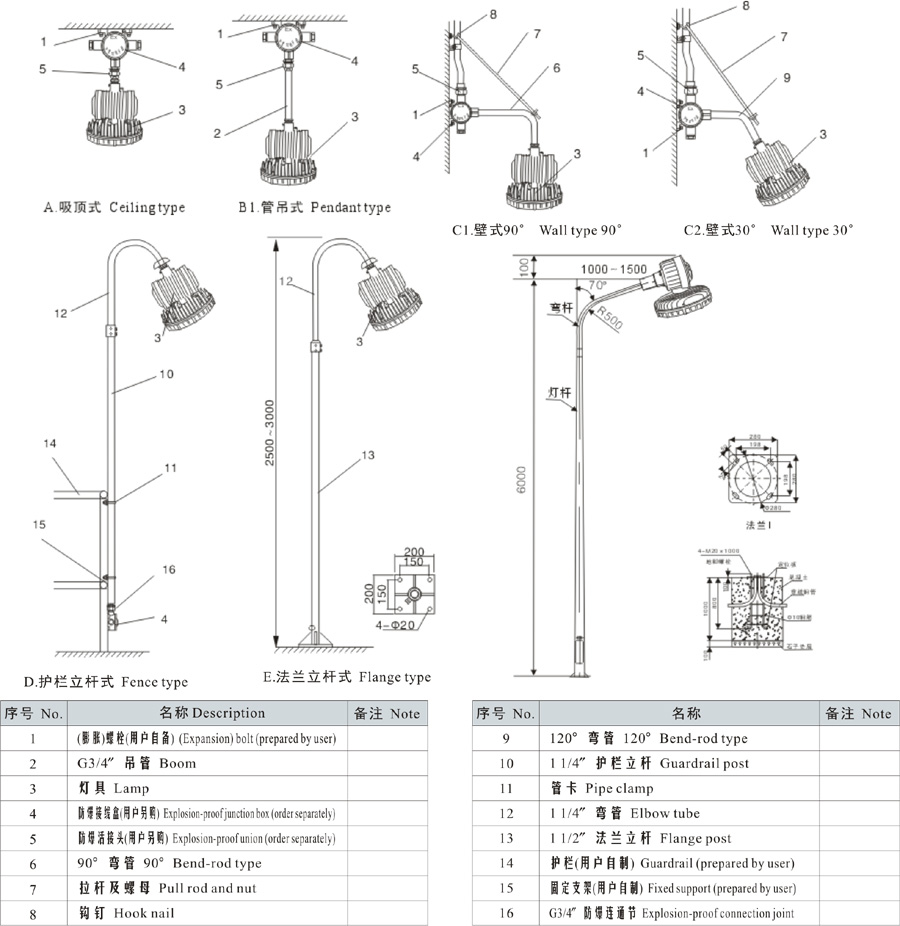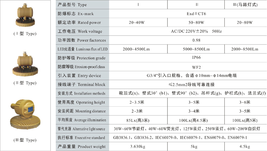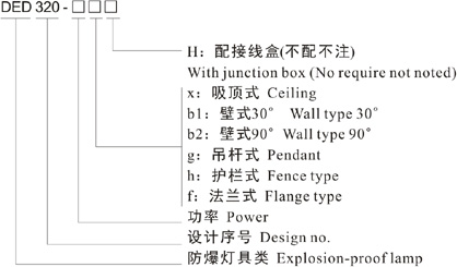 Note: 1. Select according to the product model description, pay attention to marking out the ex-mark; e.g.: Need product of 40W, 220V, pendant type, with junction box,gas explosion-proof, then the model should beDED320-40gH ExdIICT6 Gb;